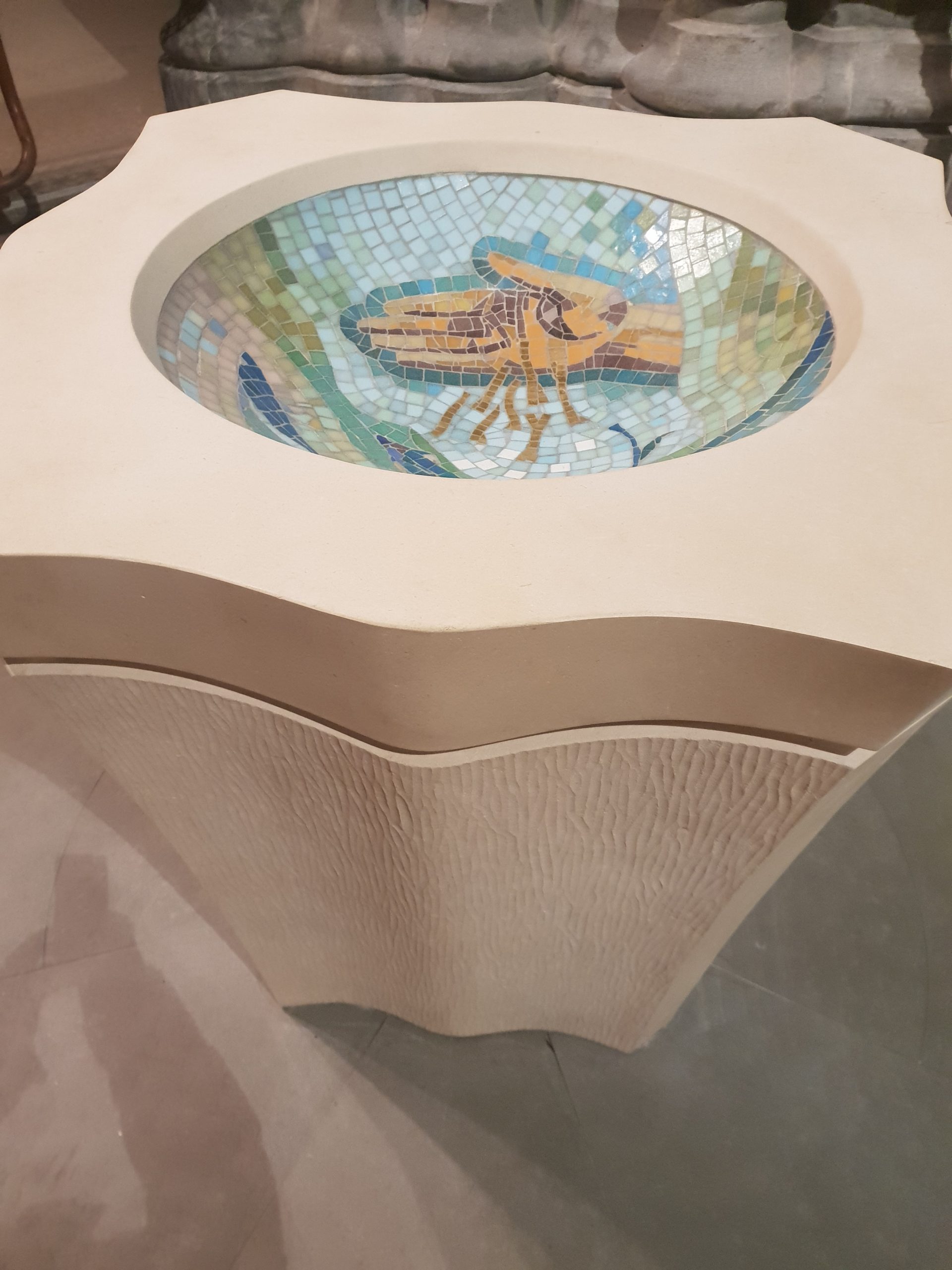 The final piece of this work has also been designed and carved by Thomas Glendon. The mosaic is the work of Laura O’Hagan. Based in Wicklow Laura’s work can also be seen in St Mel’s Cathedral in Longford. She has freely and creatively interpreted the design concept given to her by Thomas Glendon. The hand, representing the Father, is open in a gesture of blessing. From the open hand flow seven gold threads representing the seven gifts of the Holy Spirit. Fish swim freely in the swirling waters in the abundance of God’s gift. The fish are also to be found in the two angel carvings of John Hogan the Younger.